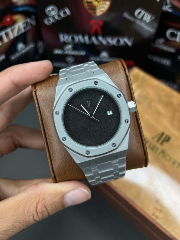 ساعت مچی مردانه از برند ای پی AP مدل رویال اوک که دارای موتور باطری ژاپن درجه 1 تقویم دار و بدنه و قاب و قفل استیل درجه 1 و شیشه ضدخش است