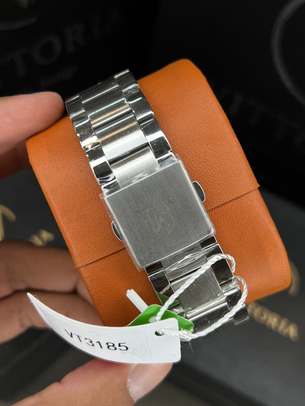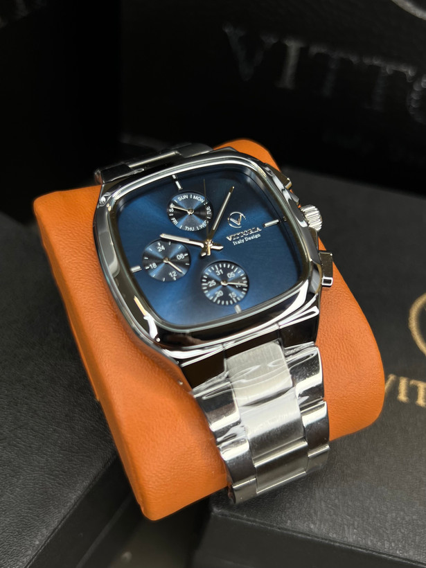 ساعت مچی مردانه پرطرفدار ایتالیایی ویتوریا که دارای موتور باطری ژاپن درجه 1فول تایم که دارای تقویمو تمامی موتورها فعال هست و بدنه و قاب و قفل استیل درجه 1 و شیشه ضدخش است