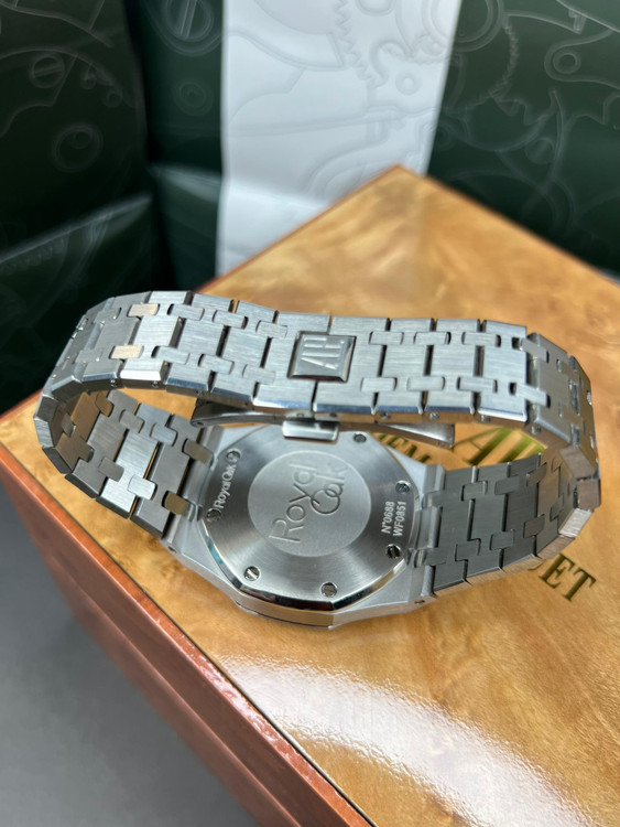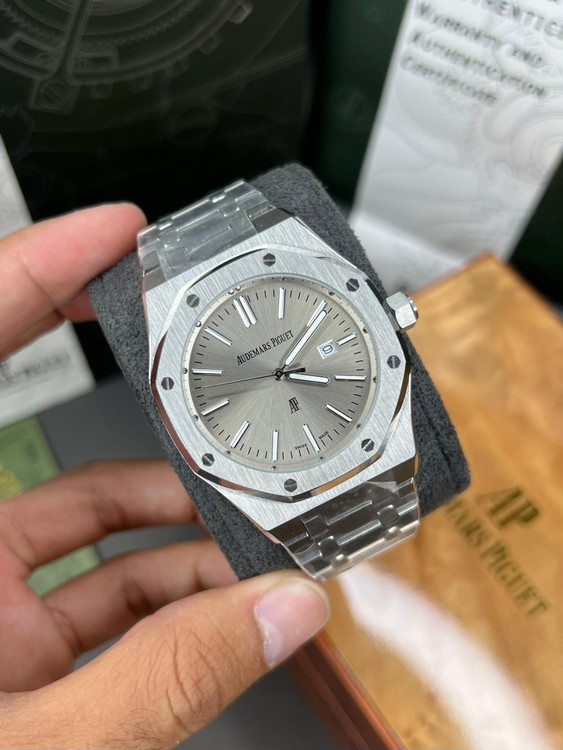 ساعت مچی مردانه از برند ای پی AP مدل رویال اوک که دارای موتور باطری ژاپن درجه 1 تقویم دار و بدنه و قاب و قفل استیل درجه 1 و شیشه ضدخش است