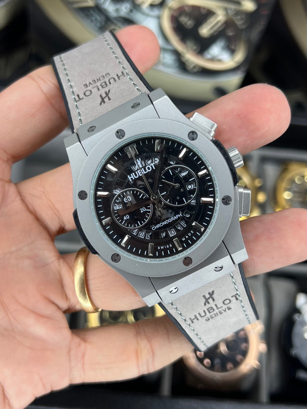 ساعت مچی مردانه کرنوگراف از برند هابلوت که دارای موتور باطری ژاپن درجه 1 تقویم دار و تمامی موتورها فعال هست و قاب و قفل استیل درجه 1 و شیشه ضدخش است