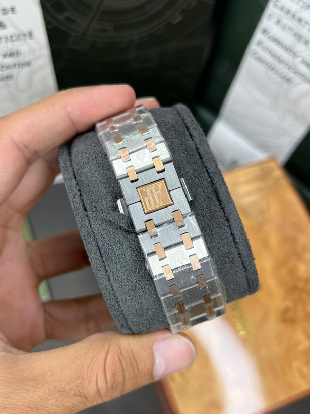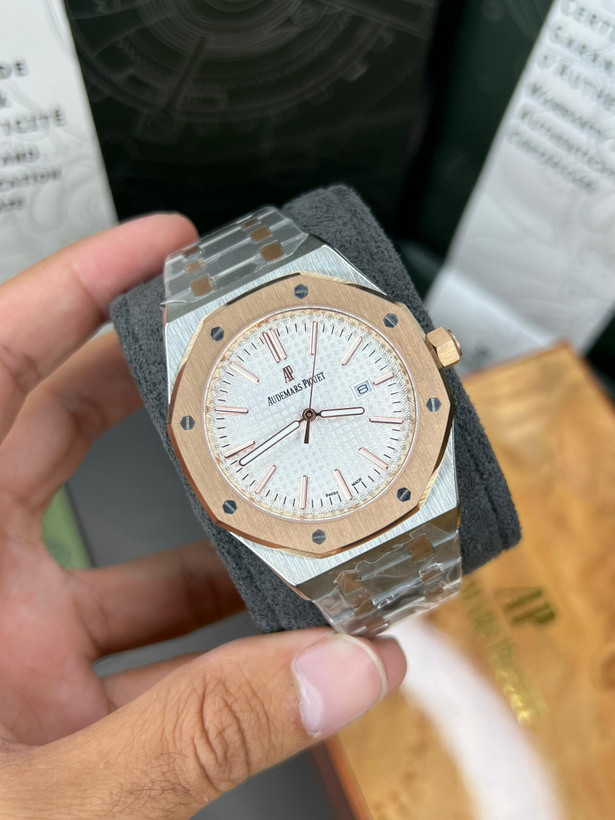 ساعت مچی مردانه از برند ای پی AP مدل رویال اوک که دارای موتور باطری ژاپن درجه 1 تقویم دار و بدنه و قاب و قفل استیل درجه 1 و شیشه ضدخش است