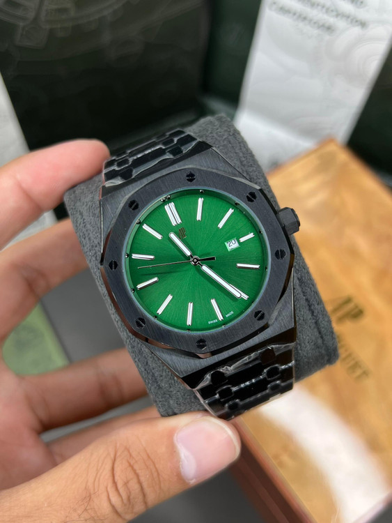 ساعت مچی مردانه از برند ای پی AP مدل رویال اوک که دارای موتور باطری ژاپن درجه 1 تقویم دار و بدنه و قاب و قفل استیل درجه 1 و شیشه ضدخش است
