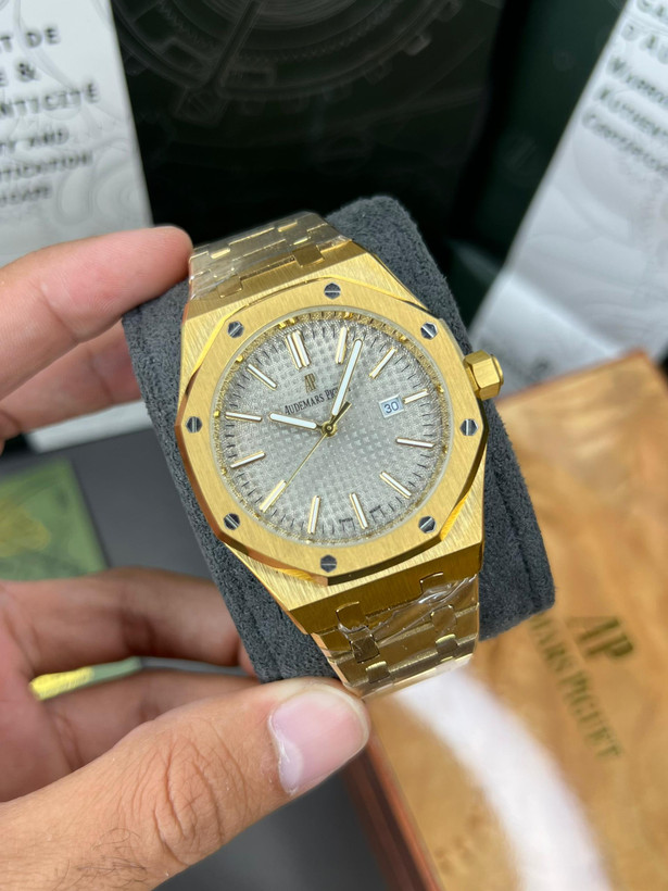 ساعت مچی مردانه از برند ای پی AP مدل رویال اوک که دارای موتور باطری ژاپن درجه 1 تقویم دار و بدنه و قاب و قفل استیل درجه 1 و شیشه ضدخش است