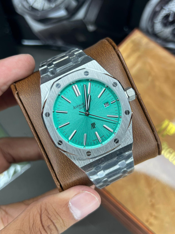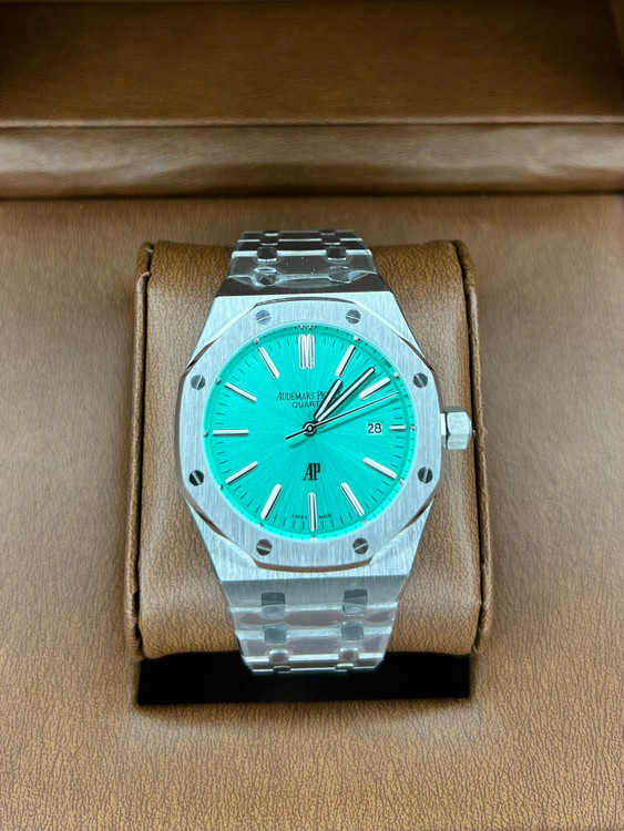ساعت مچی مردانه از برند ای پی AP مدل رویال اوک که دارای موتور باطری ژاپن درجه 1 تقویم دار و بدنه و قاب و قفل استیل درجه 1 و شیشه ضدخش است