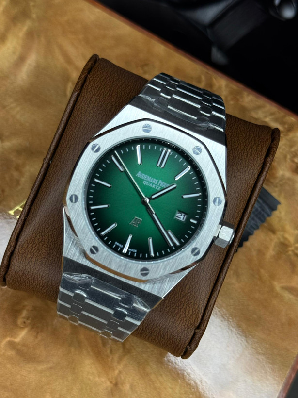 ساعت مچی مردانه از برند ای پی AP مدل رویال اوک که دارای موتور باطری ژاپن درجه 1 تقویم دار و بدنه و قاب و قفل استیل درجه 1 و شیشه ضدخش است