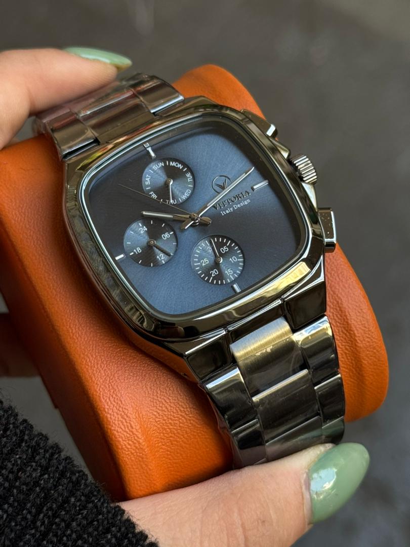 ساعت مچی مردانه پرطرفدار ایتالیایی ویتوریا که دارای موتور باطری ژاپن درجه 1فول تایم که دارای تقویمو تمامی موتورها فعال هست و بدنه و قاب و قفل استیل درجه 1 و شیشه ضدخش است