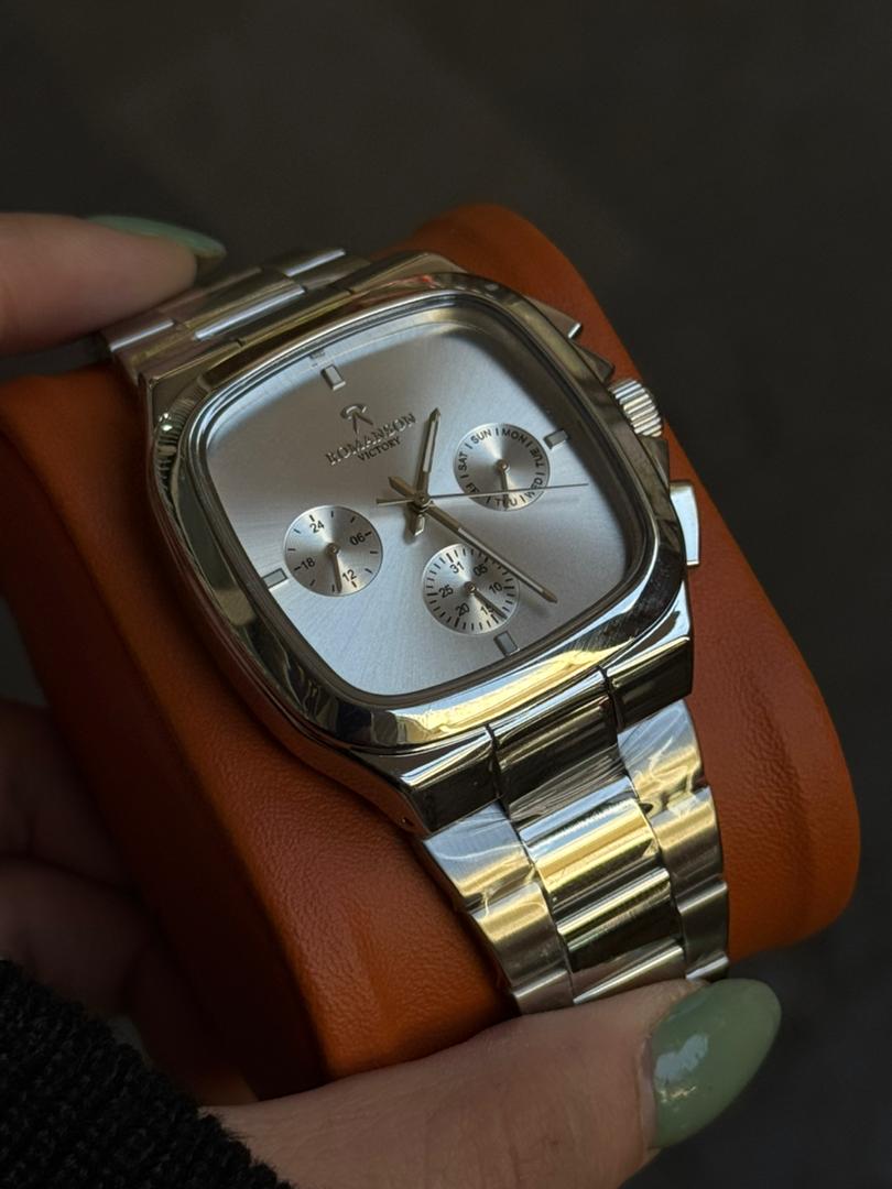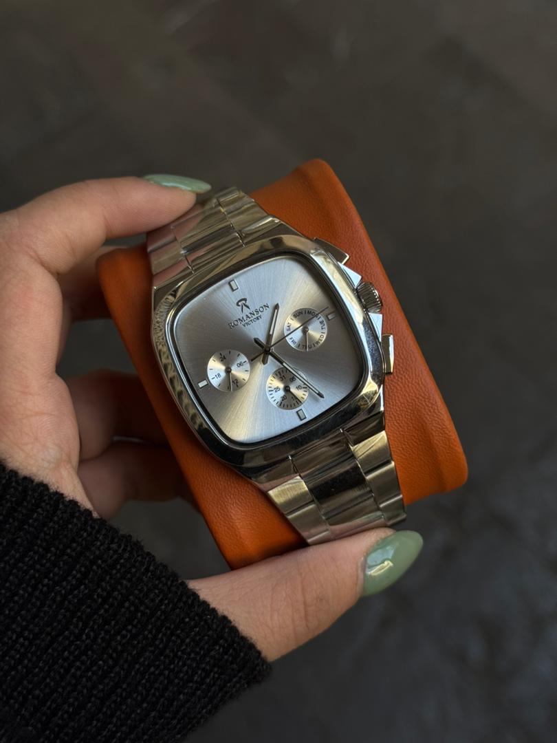 ساعت رومانسون مردانه مربعی فولتایم با بند و قاب استیل، ظاهری خاص و شیک داره که هم برای استایل رسمی مناسبه هم روزمره. طراحی مربعی، حس خاصپسندی و تمایز میده و جنس استیلش دوام و درخشش بالایی داره. موتور دقیق کوارتز باعث عملکرد مطمئنش میشه و گزینهای جذاب برای آقایان خوشسلیقه محسوب میشه