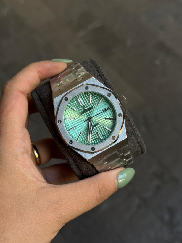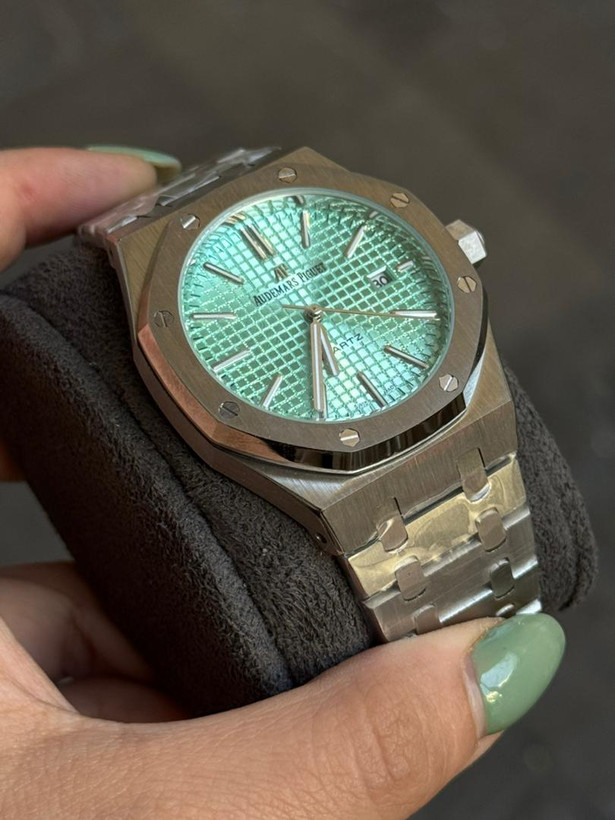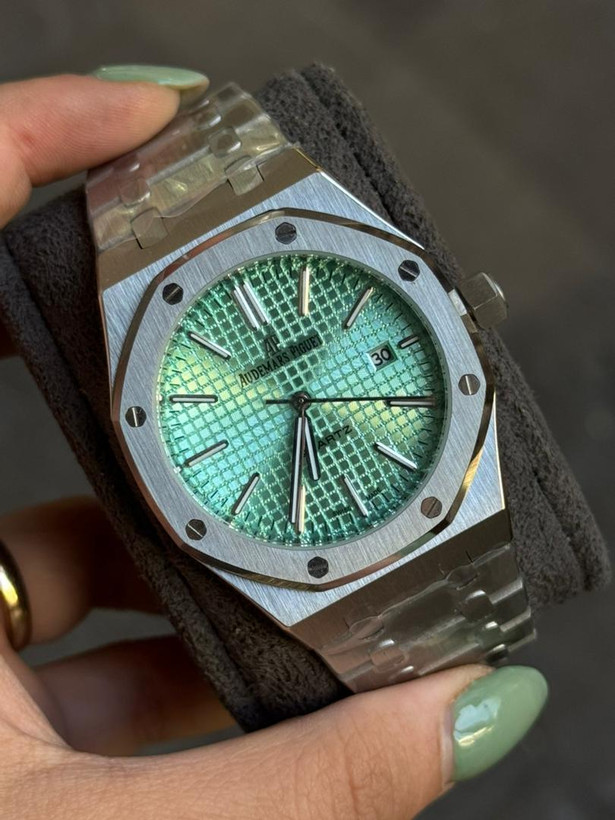 ساعت مچی مردانه از برند ای پی AP مدل رویال اوک که دارای موتور باطری ژاپن درجه 1 تقویم دار و بدنه و قاب و قفل استیل درجه 1 و شیشه ضدخش است